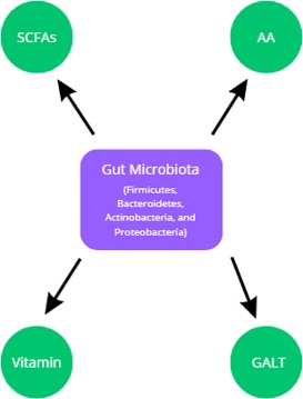 Beyond their metabolic contributions, the gut microbiota engages in a dynamic interplay with host physiology by modulating hormone production, neurotransmitter signaling, and systemic inflammatory responses [6]. Beneficial bacteria such as Bifidobacterium and Lactobacillus are known for their ability to produce antimicrobial peptides and compete with pathogenic microbes for adhesion sites, thereby preventing colonization by opportunistic pathogens [6]. Moreover, SCFAs generated by bacterial fermentation help maintain a balanced pH in the gut, inhibiting the overgrowth of potentially harmful bacteria such as Enterobacteriaceae [6]. These biochemical processes collectively preserve intestinal homeostasis and play a crucial role in neonatal gut development, particularly in preterm infants, whose microbiota composition is more susceptible to environmental perturbations [6]. Figure 1 summarizes these mechanisms.